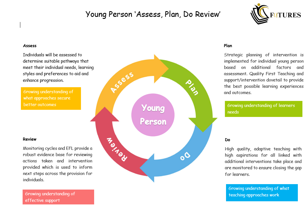 The Assess, Plan, Do, Review cycle Educate U Futures uses the assessment framework to provide a curriculum which removes barriers to learning and puts effective educational provision in place. The support takes the form of a four-part cycle through which earlier decisions and actions are revisited, refined and revised with a growing understanding of the student’s progress, their needs and what further support is required for the student to make good progress and secure positive outcomes. See Figure 1. The ‘assess, plan, do, review’ cycle can be repeated as many times as needed to help the child or young person progress. Some young people or young people will show good progress after the first round of support is put in place, but those with more complex needs might benefit from the cycle being repeated several times.